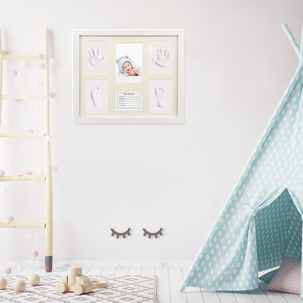 このフレームでは、お子様の小さな手形と足形を残すことができます。お子様が大きくなった際には素敵な思い出の品となること間違いないです。お子様も自身の成長を確認することができ、また、ご両親もお子様が生まれたときの感動を思い出すことができます。通常の写真立てとは一線を画し、このセットはご両親と新しく生まれたお子様の特別な時を独自の方法でとらえます。
